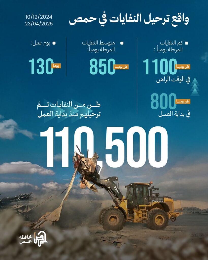 أنفوغراف تفصيلي حول واقع ترحيل النفايات في محافظة حمص منذ بداية العام وحتى نيسان 2025