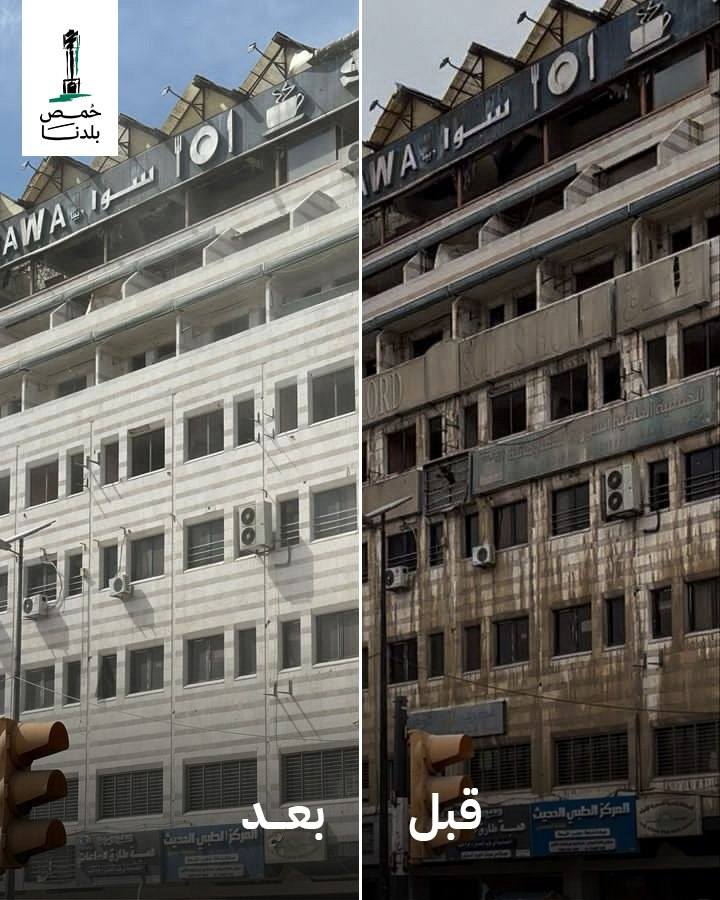 الانتهاء من أعمال إعادة تأهيل مبنى المعلمين وبناء عطاء الله (المتنبي)، عبر تنظيفه باستخدام السفع الرملي وذلك ضمن حملة “حمص بلدنا”.