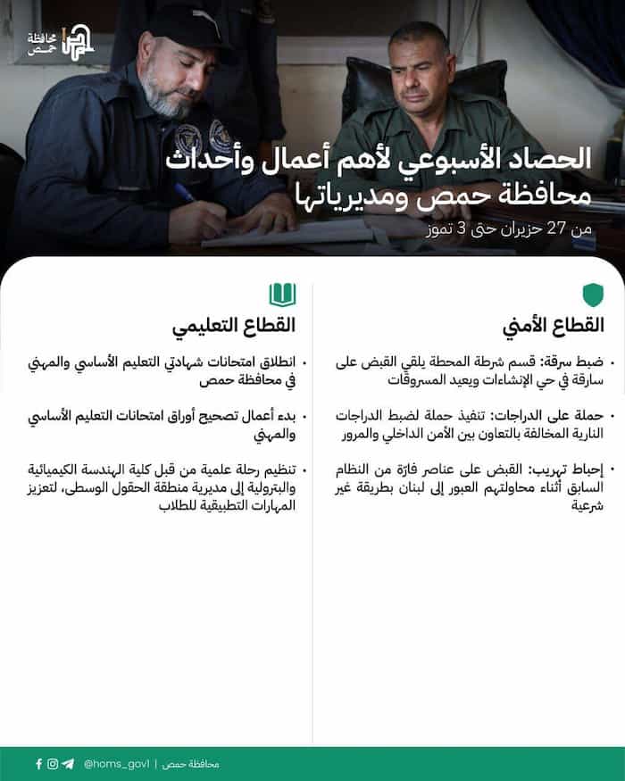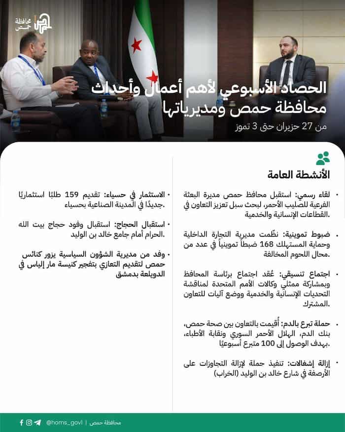 الحصاد الأسبوعي لأهم أعمال وأحداث محافظة حمص ومديرياتها من 27 حزيران حتى 3 تموز