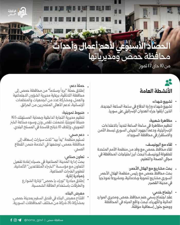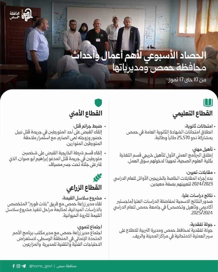 الحصاد الأسبوعي لأهم أعمال وأحداث محافظة حمص ومديرياتها من 10 حتى 17 تموز 17/07/2025 في الحصاد الأسبوعي الحصاد الأسبوعي لأهم أعمال وأحداث محافظة حمص ومديرياتها، الفترة من 10 حتى 17 تموز . 1الحصاد الأسبوعي لأهم أعمال وأحداث محافظة حمص ومديرياتها من 10 حتى 17 تموز 2الحصاد الأسبوعي لأهم أعمال وأحداث محافظة حمص ومديرياتها من 10 حتى 17 تموز (1)