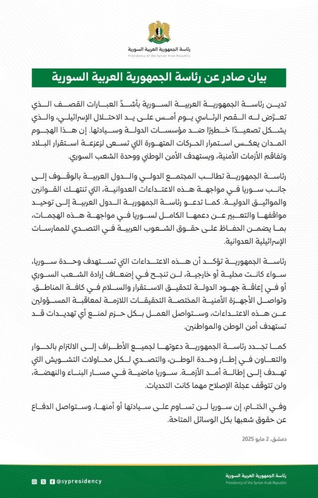 بيان صادر عن رئاسة الجمهورية العربية السورية 02/05/2025 في الأخبار بيان صادر عن رئاسة الجمهورية العربية السورية بيان صادر عن رئاسة الجمهورية العربية السورية