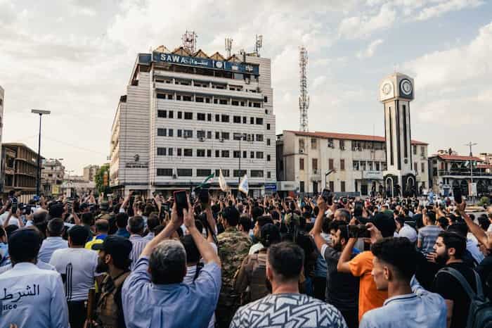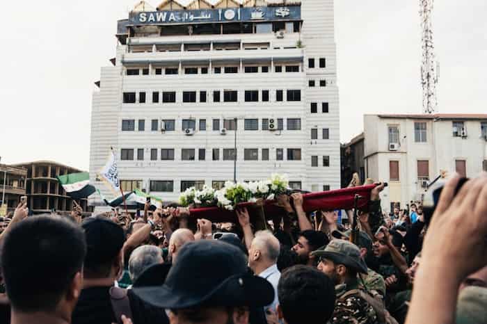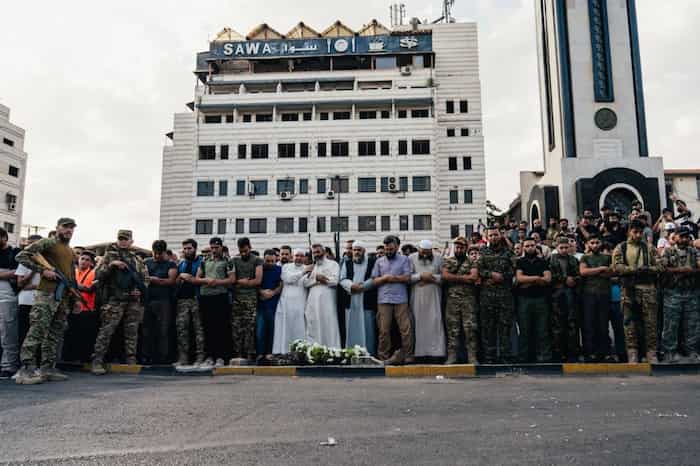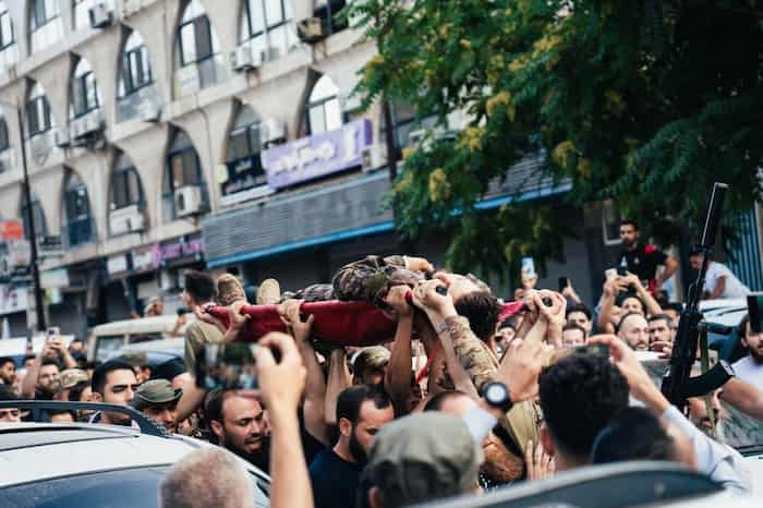 حشود من أبناء حمص خلال تشييع شهداء وزارة الدفاع، الذين ارتقوا جرّاء العدوان الإسرائيلي على سوريا.