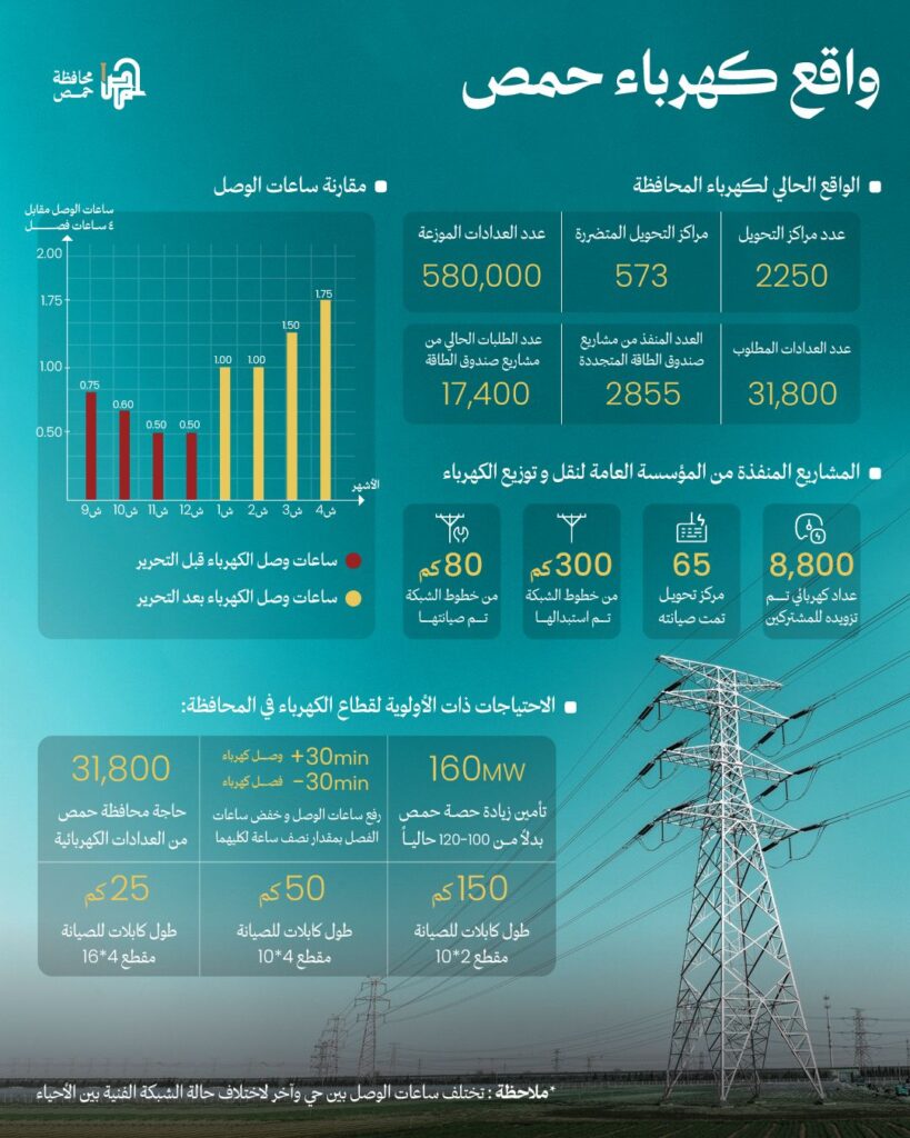 أنفوغراف تفصيلي حول واقع الكهرباء في محافظة حمص منذ بداية العام وحتى نيسان 2025 22/04/2025 في أخبار المحافظة أنفوغراف تفصيلي حول واقع الكهرباء في محافظة حمص منذ بداية العام وحتى نيسان 2025 22